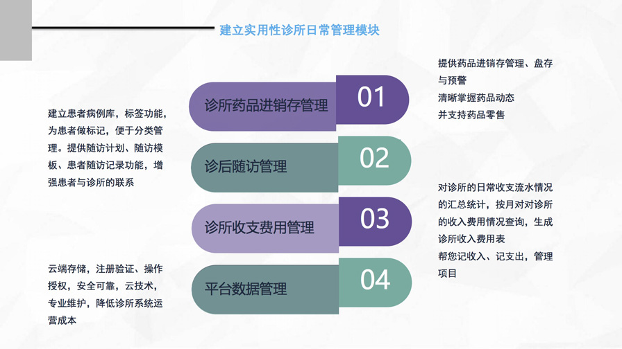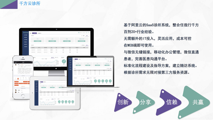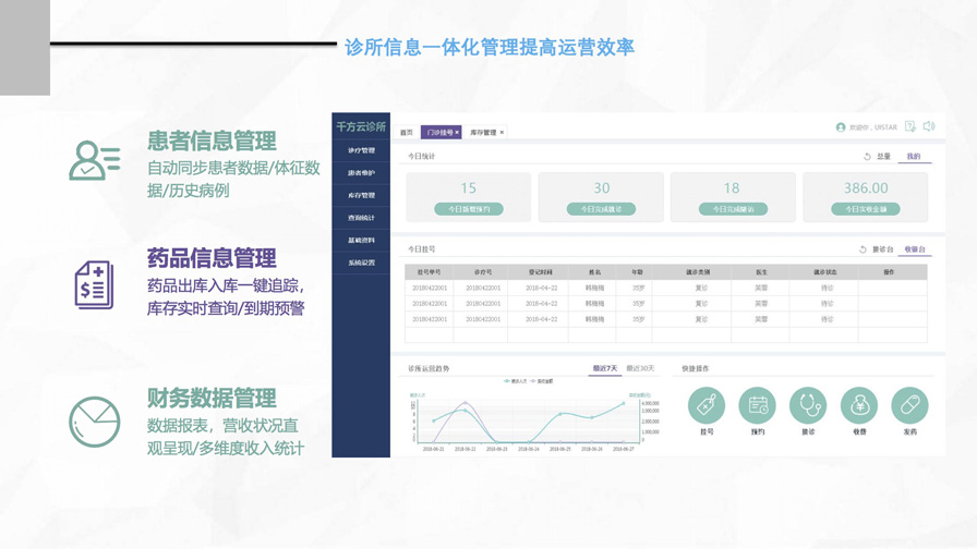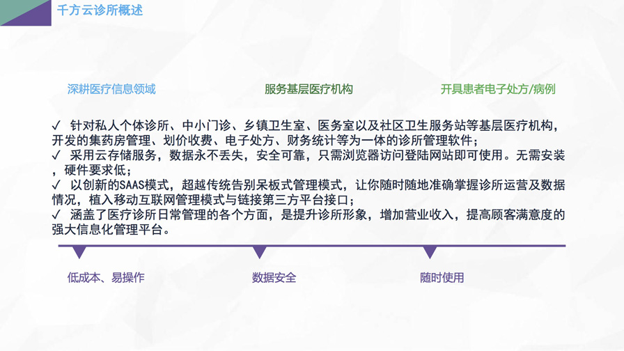 千方云診所是集藥房管理、劃價(jià)收費(fèi)、電子處方、財(cái)務(wù)統(tǒng)計(jì)、中醫(yī)智能診斷等為一體的診所管理軟件。采用云存儲(chǔ)服務(wù),數(shù)據(jù)永不丟失,安全可靠,只需瀏覽器訪問登陸網(wǎng)站即可使用。